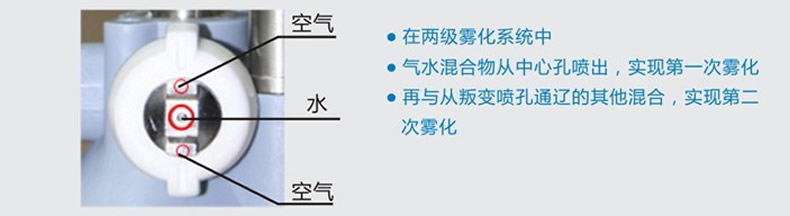 由于空压设备的限制,压缩空气的压力总是在一定范围内波动。雾化喷嘴喷射出的压缩空气压力越高,在水管路和比例调节装置内形成的负压(真空)越大,比例调节装置允许通过的水量越多。因此通过比例调节装置恒定了压缩空气流量与水流量的比例,即恒定了喷雾效果。解决了因压缩空气压力的变化而水雾忽大忽小、雾化颗粒忽粗忽细的问题。同时,通过调节比例调节装置顶部的螺母,可以设定喷雾的大小和雾化颗粒的粗细,一旦设定好了,恒定不变。