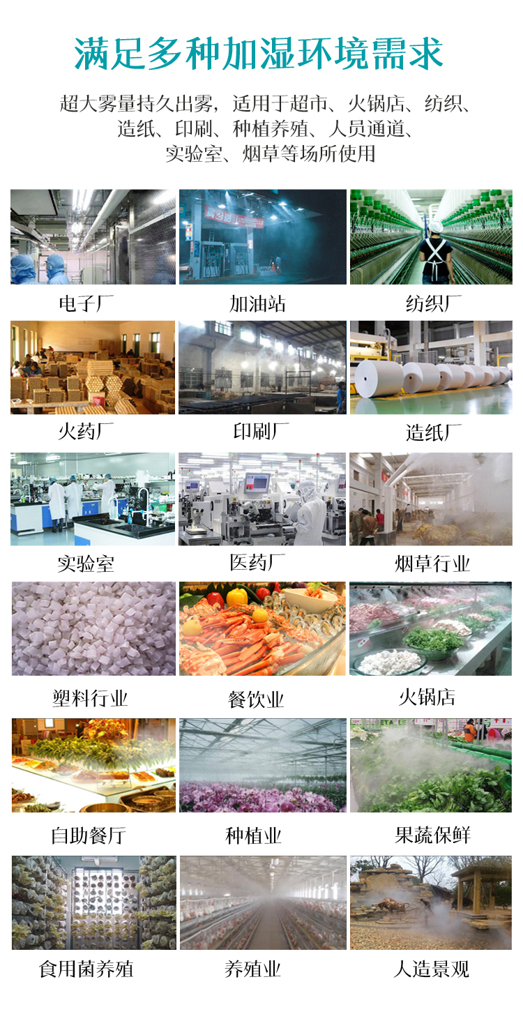 2, 安装简便,接通水源开机即可达到加湿目的,故障率极低,后期维护保养非常省时省力,运行过程中对加湿空间无任何污染
